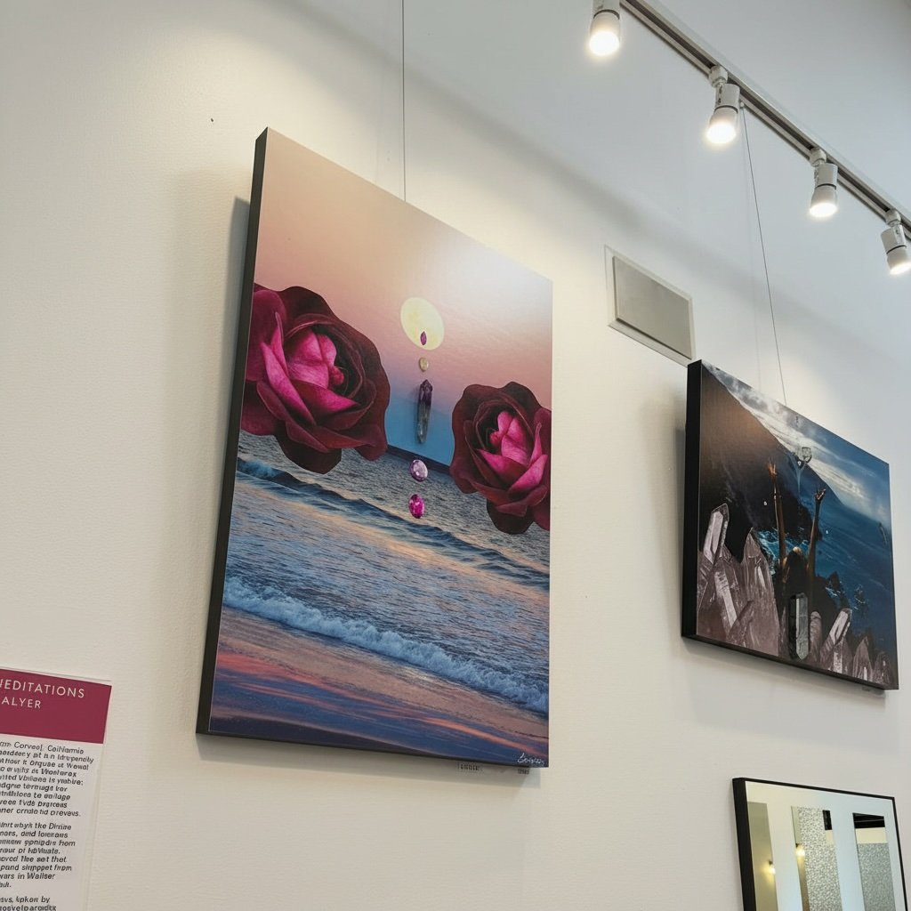 “Blooming with the Moon” is a 2×3 foot composite photograph from my 2022 solo exhibition, Mother Nature Meditations, in San Francisco. It captures the full moon rising over a glittering ocean, transformed into a surreal landscape through the addition of an amethyst crystal and rhinestones layered on top. This piece transforms photographic reality into a mystical dream. It was purchased from the show and now resides in a private collection in Mill Valley, California.