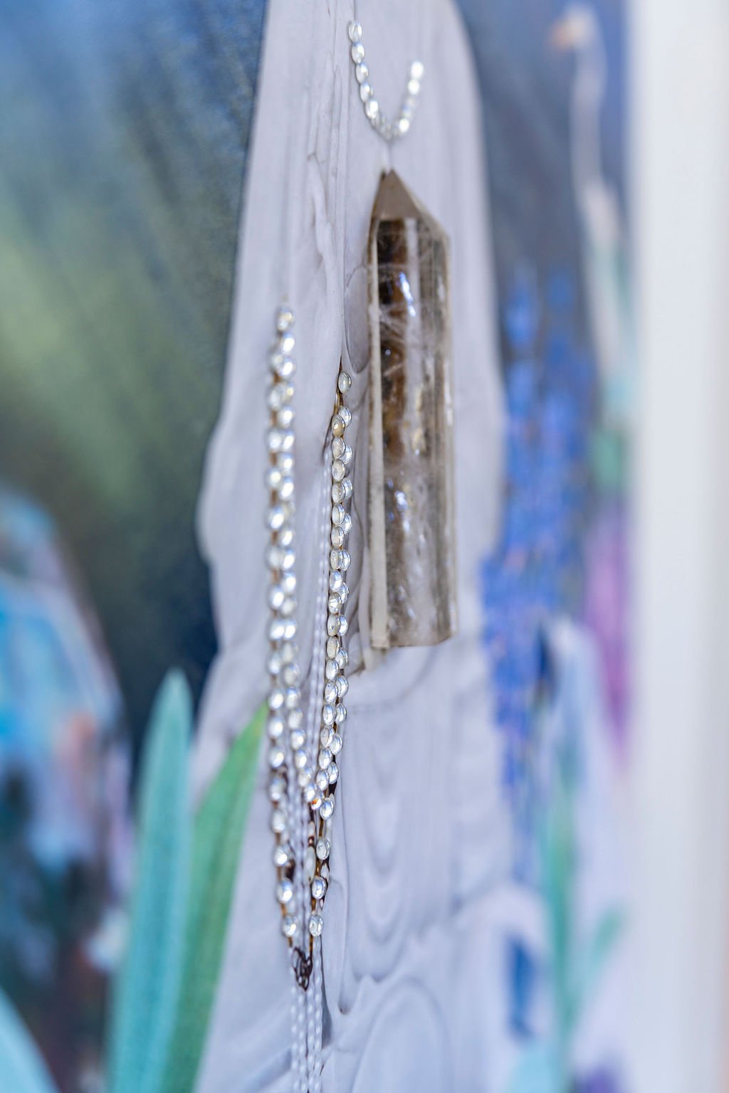 Quan Yin Compassion” is a mixed media sanctuary depicting the Bodhisattva of Mercy, sitting under a painted galaxy of stars while resting on a bed sage, lavender, quartz, and amethyst, elements that connect the viewer to her serene healing frequency. A crystal embedded in her crown radiates light from behind, transforming ambient light into ethereal rainbow reflections. This luminous interaction with light, along with layered symbolism like the guiding white cranes, create a piece where viewers are invited to experience the vibrations of Quan Yin, her boundless inner peace, and compassion for humanity.