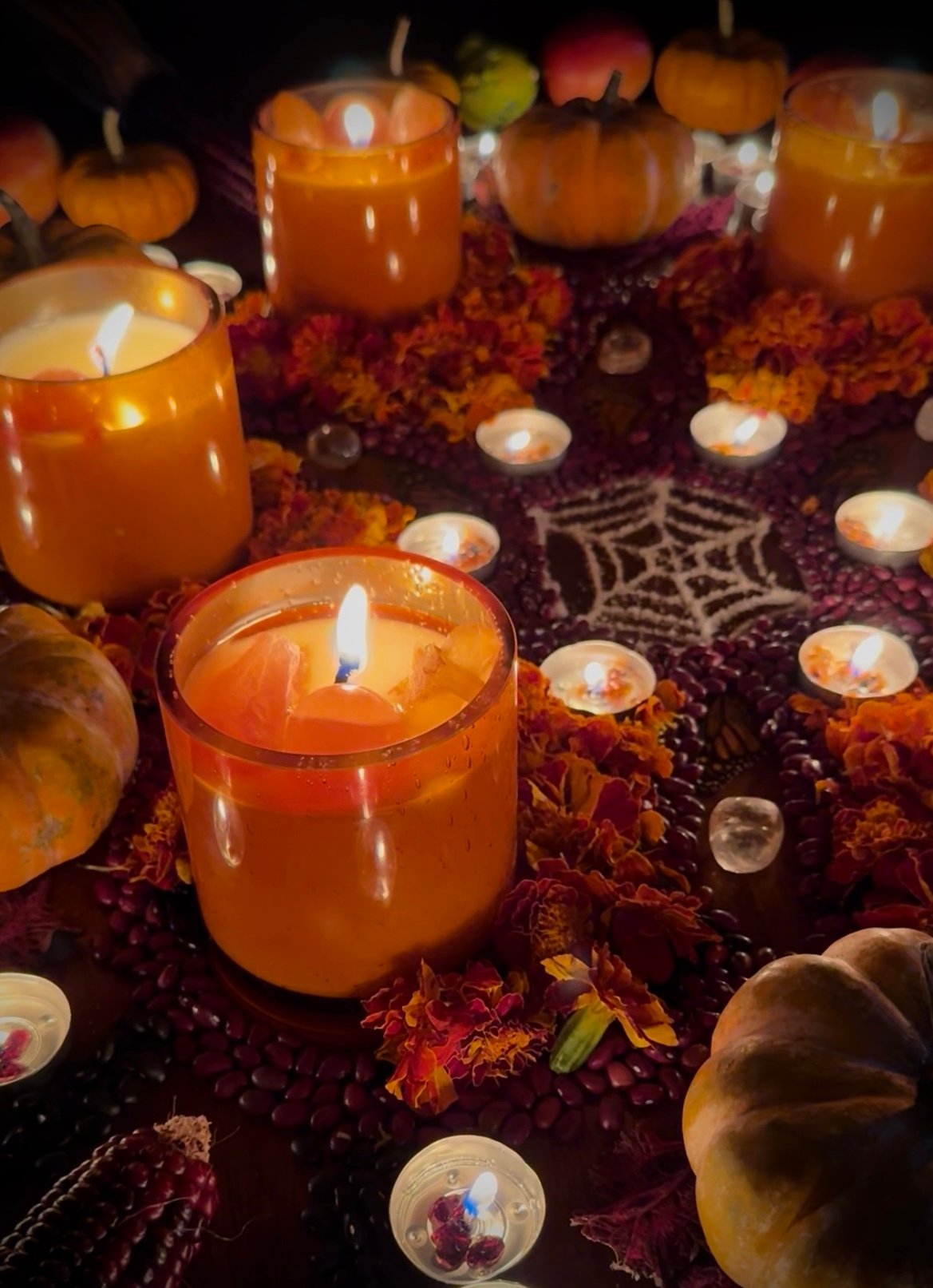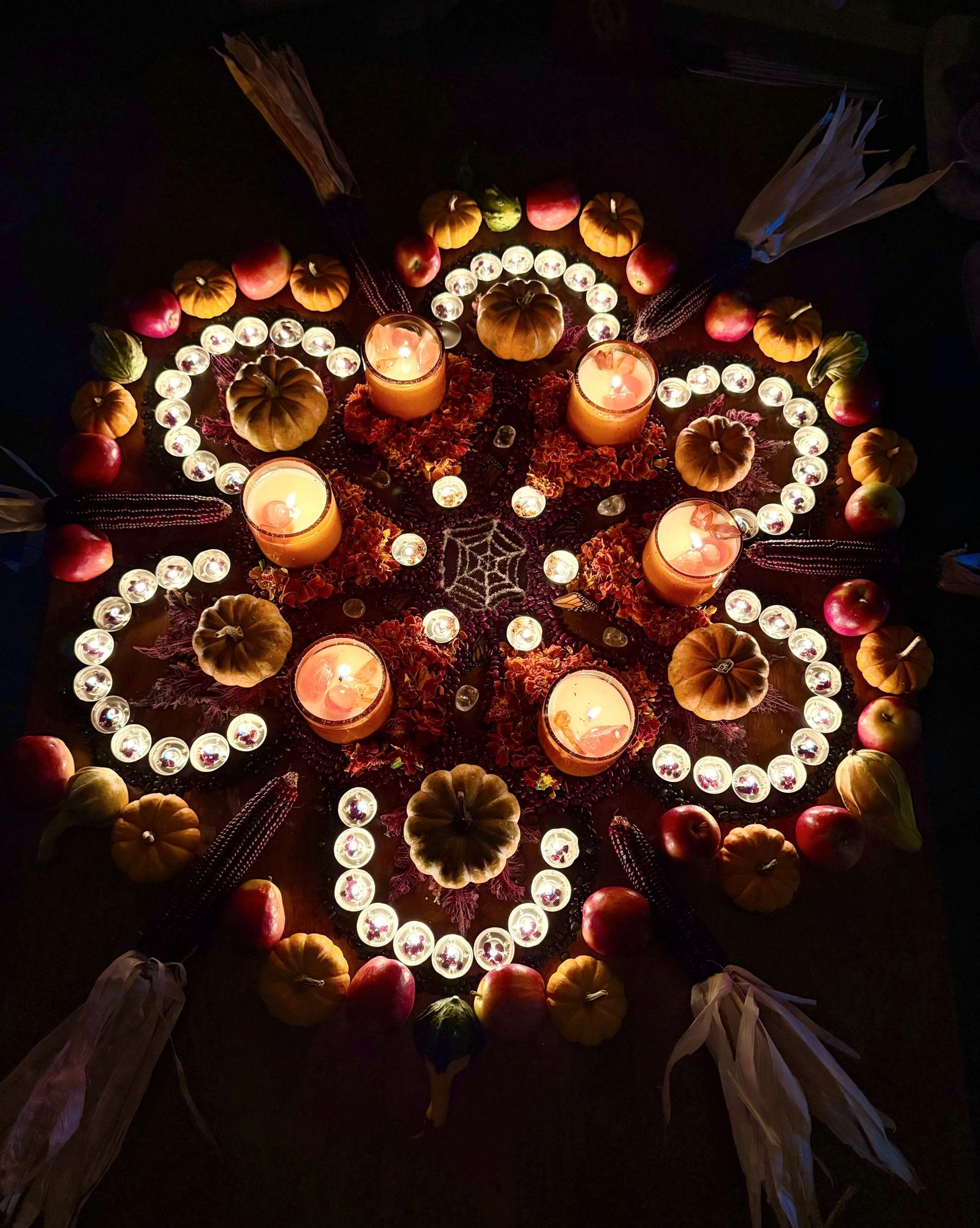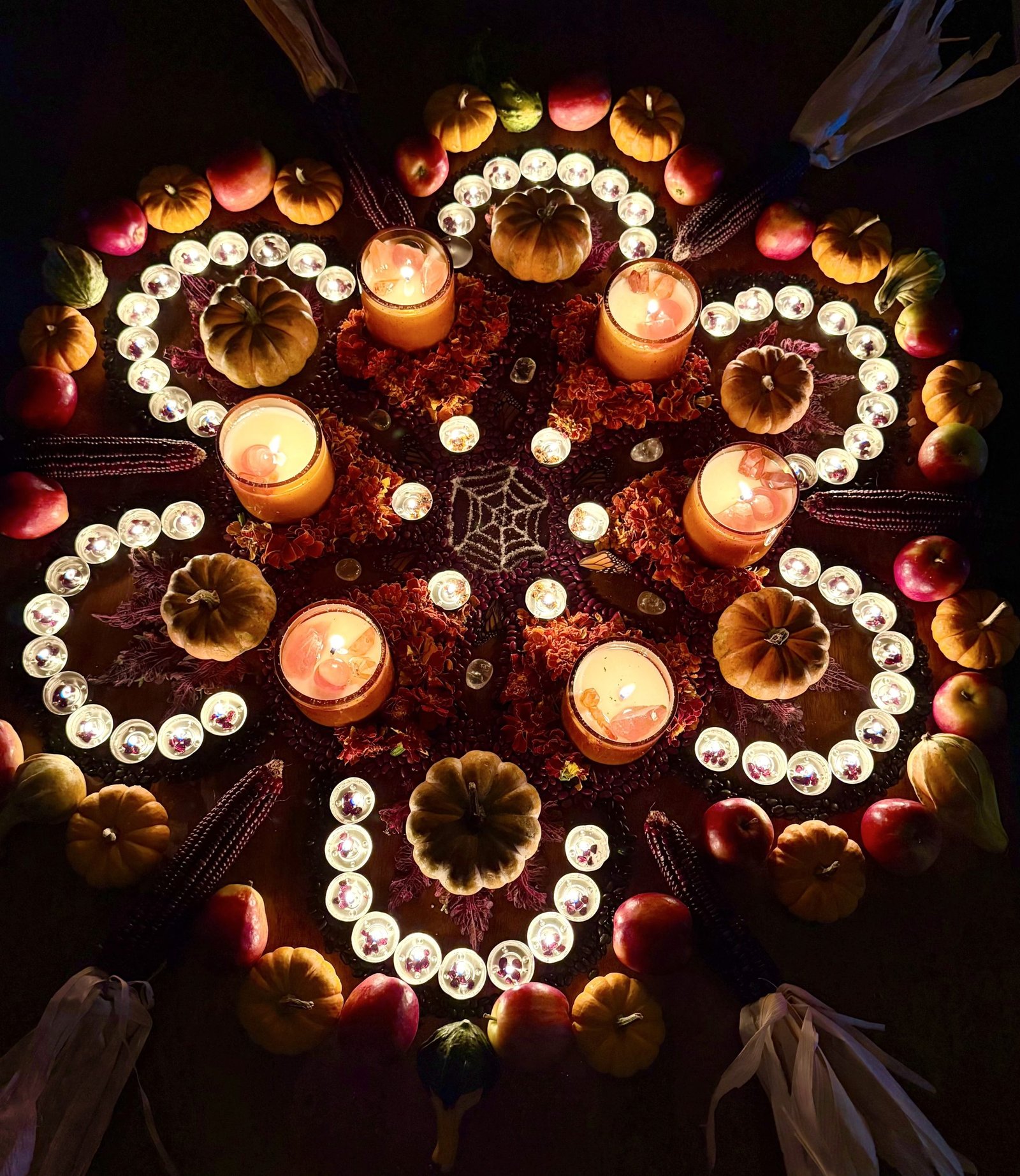 Samhain Mandala” is an ephemeral piece presented through video documentation and a final photograph, capturing the ritual of creation of a sacred geometry altar in the symbol of the Flower of Life. This piece is composed of harvest elements including carnation flowers, salt, corn, pumpkins, black and kidney beans, squash, and handmade candles, each acting as a traditional symbol of abundance, transition, and remembrance, central to the Samhain season. The process is a key component of the art, guided by the shapes of brass sound bowls. Their vibrations align with the intention of creating this sacred space as a meditative, sonic ritual. This temporary arrangement harnesses the Flower of Life’s ancient geometry, a universal pattern of creation and interconnection. It honors the thinning of the ancestral veil, and connecting the shared human experience of the harvest and introspection within the autumn season.