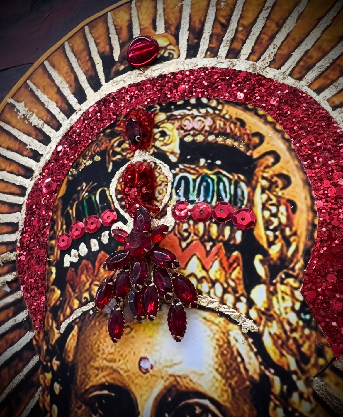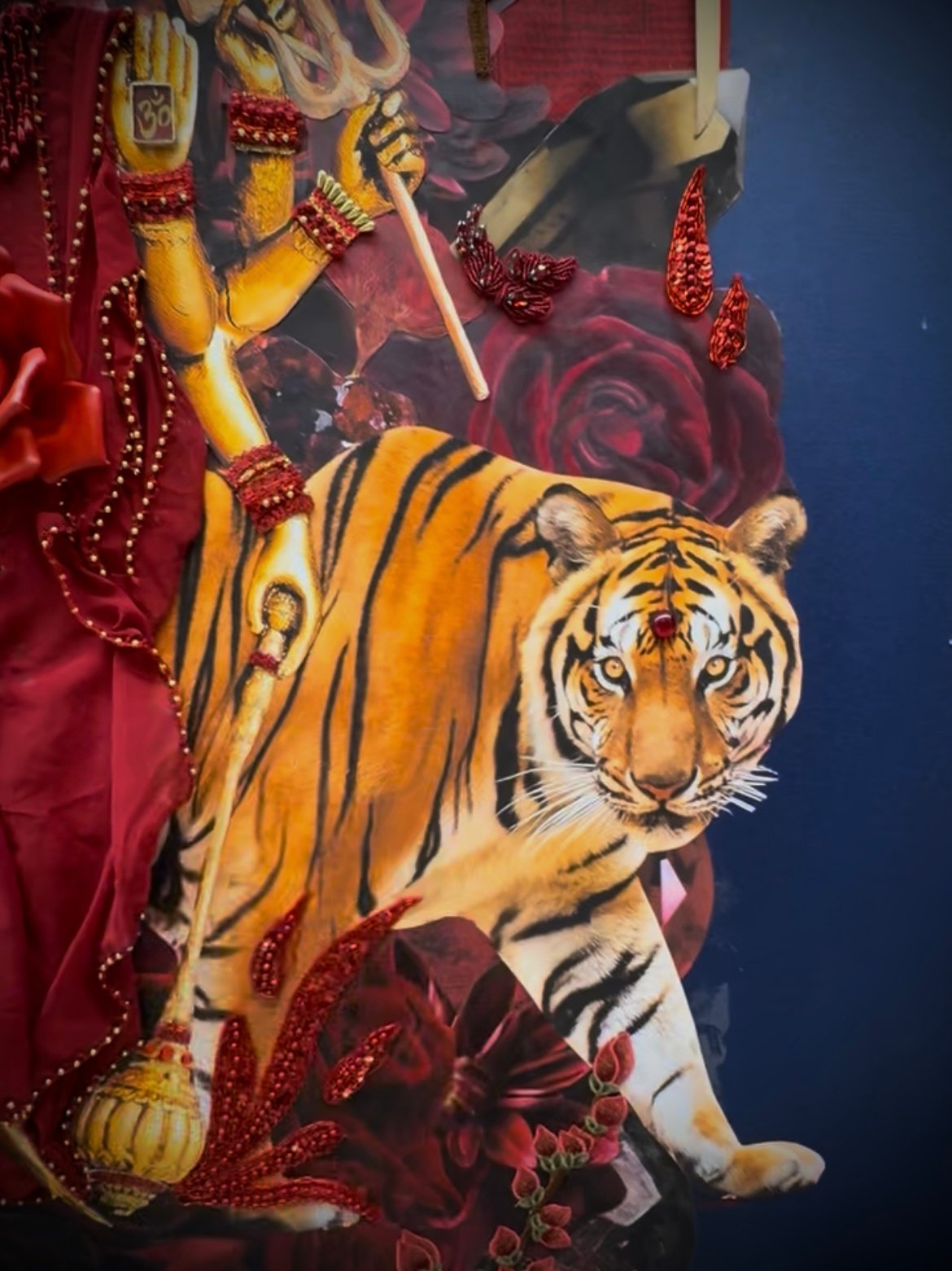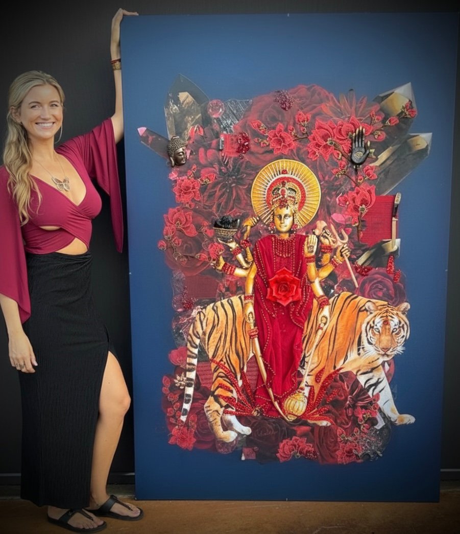 Shakti Rising” is a mixed media piece depicting the Hindu Goddess Durga Ma, created with acrylic paint, vintage textiles, photographs, antique objects, and symbolic crystals that explore the archetype of the inner warrior, which Durga Ma represents. Each element, from a sequin dripping knife to a sari made from a repurposed belly dancing skirt, serves as an emblem of reclaimed inner power and courageous transformation. The work invites the idea of sacred alchemy, urging the viewer to witness and awaken their own fierce, creative potential.